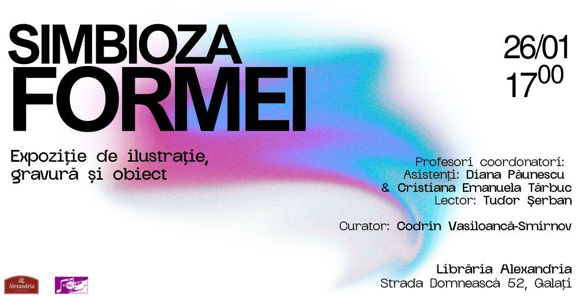 Luni, 26 ianuarie, la ora 17:00, Librăria „Alexandria” din Galați găzduiește vernisajul expoziției „Simbioza formei”, care reunește lucrări de ilustrație, gravură și obiect artistic realizate de studenții Facultății de Arte a Universității „Dunărea de Jos”, conform %source%. Evenimentul pune în lumină diversele tehnici vizuale și dialogul dintre acestea în arta contemporană.