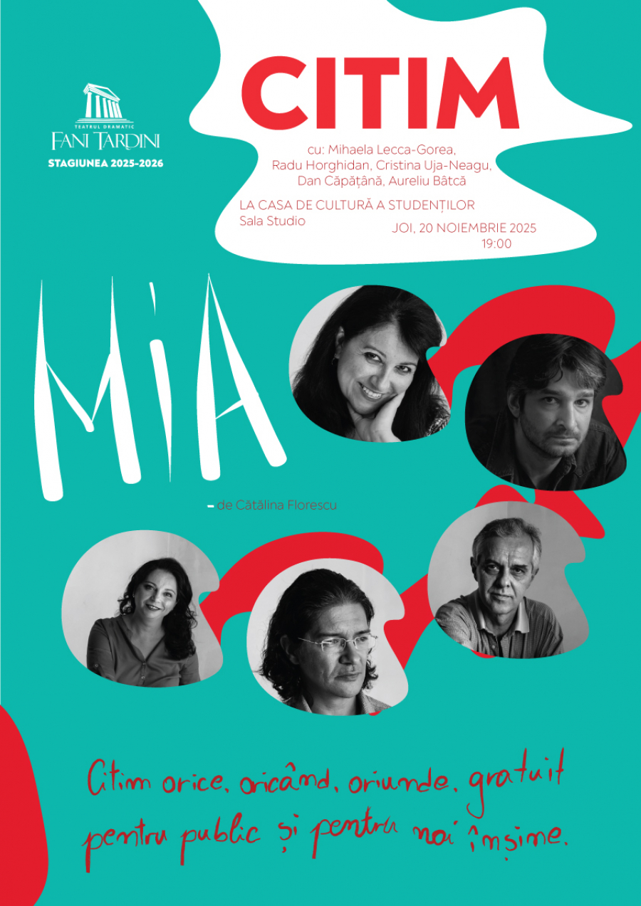 Joi, 20 noiembrie, la Casa de Cultură a Studenților din Galați, Sala Studio, de la ora 19:00, actorii teatrului „Fani Tardini” vor susține lectura piesei „Mia” de Cătălina Florescu. Vor juca Mihaela Lecca-Gorea, Radu Horghidan, Cristina Uja-Neagu și Aureliu Bâtcă.