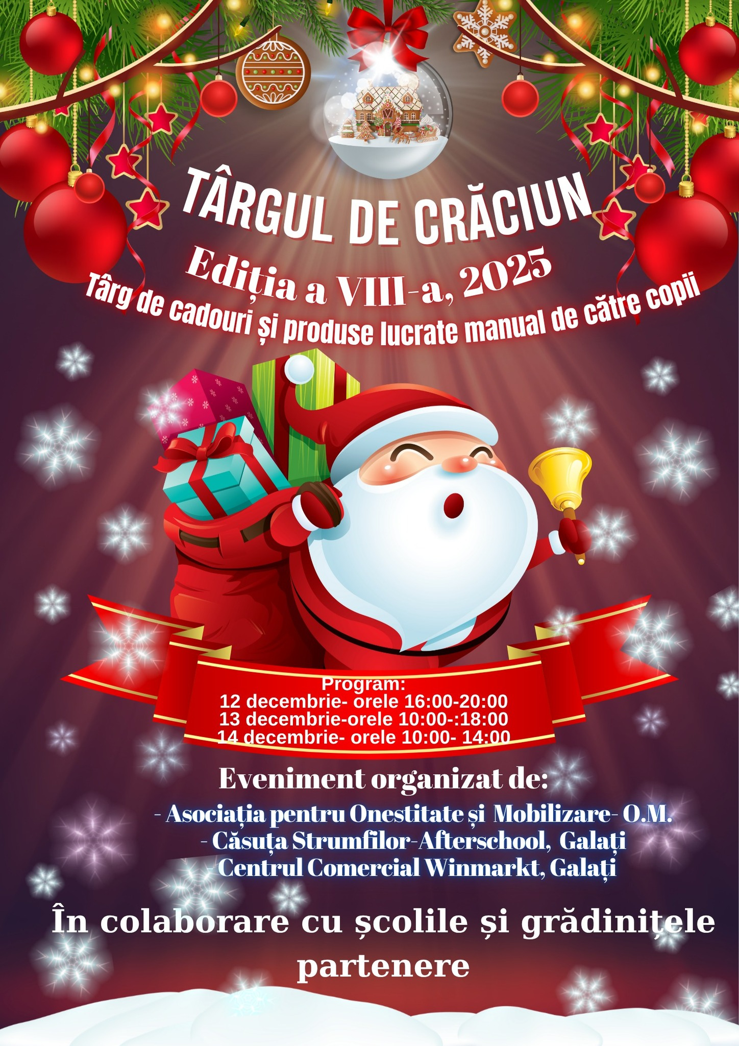 Asociația OM, Căsuța Ștrumfilor și Centrul Comercial Winmarkt Galați invită publicul, în perioada 12-14 decembrie, să viziteze și să cumpere produsele realizate manual de copii. Evenimentul are scop caritabil, dar și educativ, punând accent pe creativitate și negociere financiară.